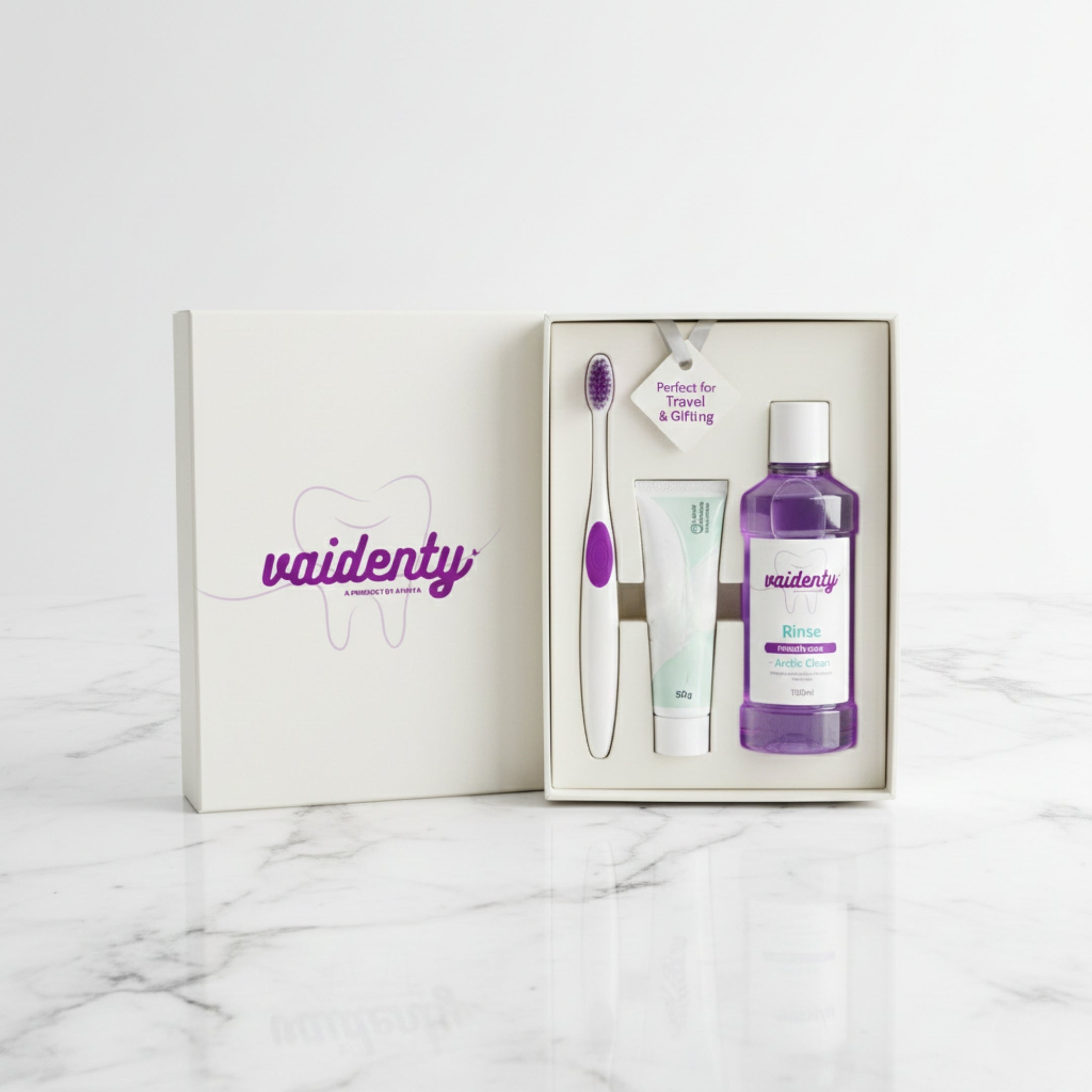 A complete oral care combo featuring a toothbrush, toothpaste, and mouthwash perfect for travel or gifting.