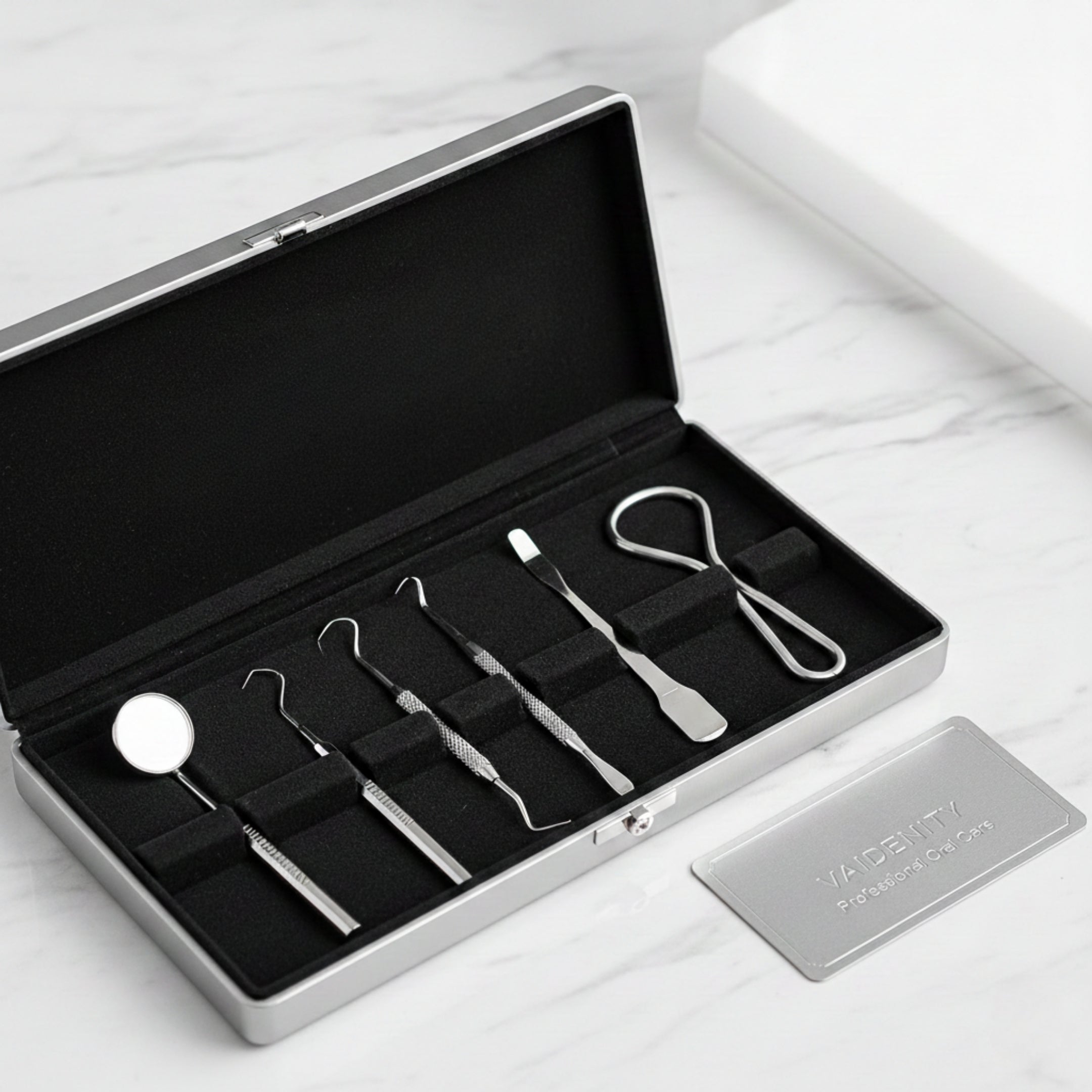 A professional-grade kit containing stainless steel dental instruments ideal for home or clinic use. Helps with plaque removal, inspections, and oral hygiene.